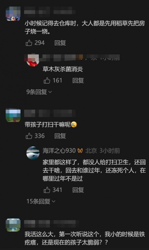有网友回忆:小时候记得去仓库时,大人都是先用稻草把房子烧一烧。你看,老一辈人其实有这个意识。那个年代物质条件差,但他们用土办法--进去之前先消杀一遍。反倒是我们这一代人,科技发达了,认知却退化了。