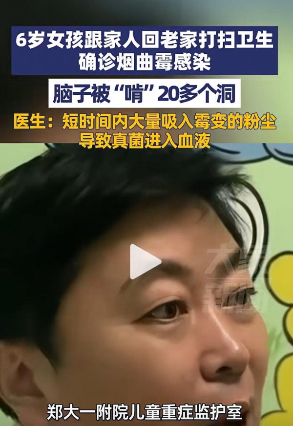 近日,河南郑州发生了一件让人心碎的事。一个6岁的小女孩,跟着家人回老家打扫卫生,本是迎新年的喜事,谁曾想竟酿成大祸--孩子确诊烟曲霉感染,脑子被啃出20多个洞!